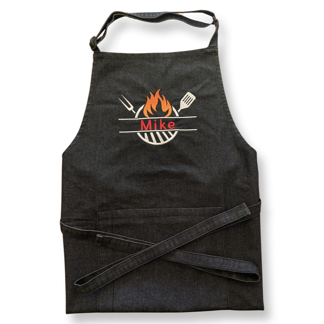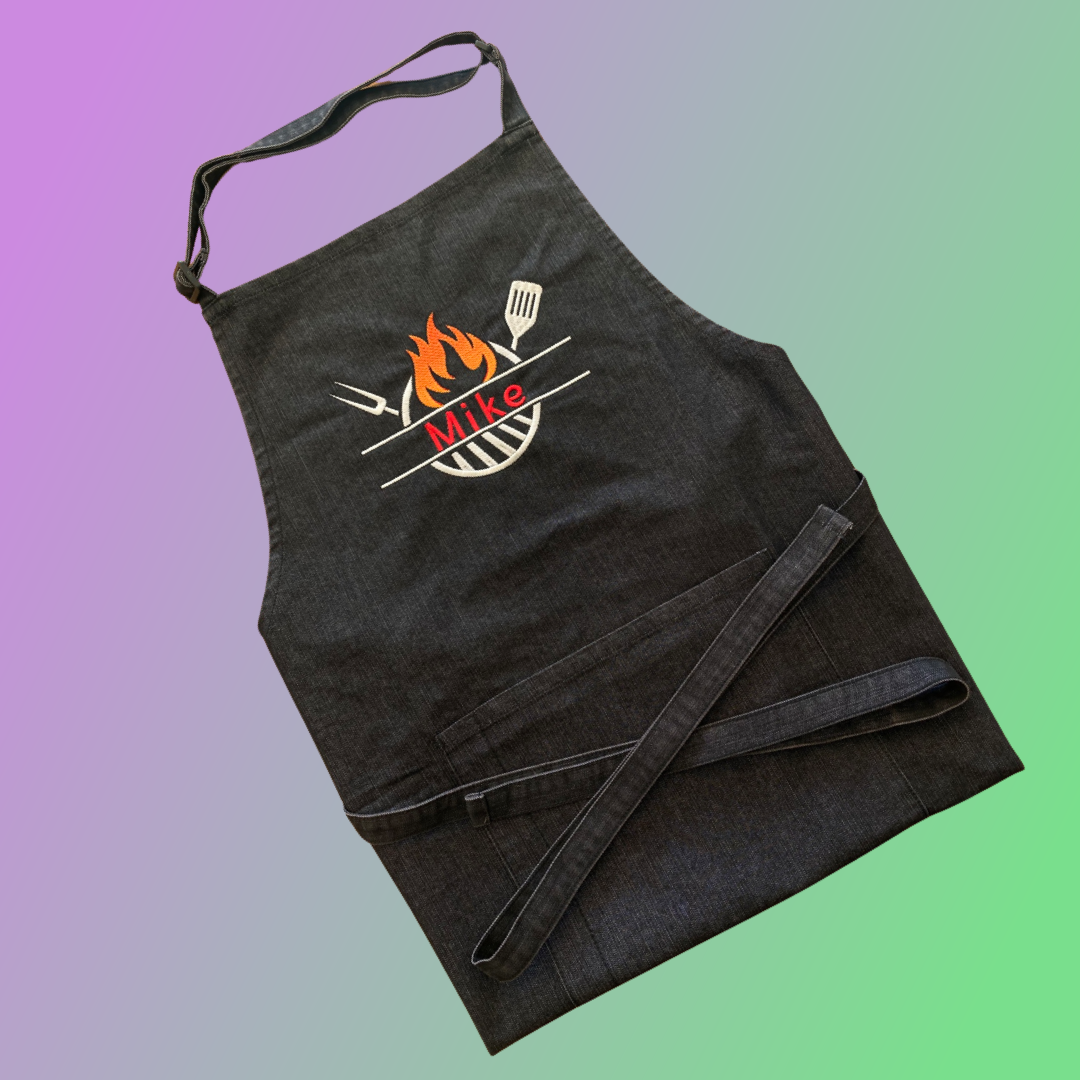 - Custom embroidered with a grill and utensils