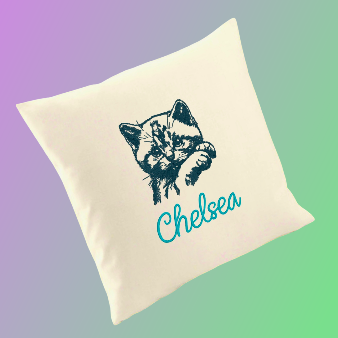 - Custom embroidered with a choice of cat breed and name (up to 12 characters)