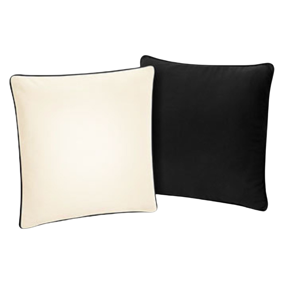 - Soft canvas cushion cover in natural on the front, black on the back, and black piping around the edges