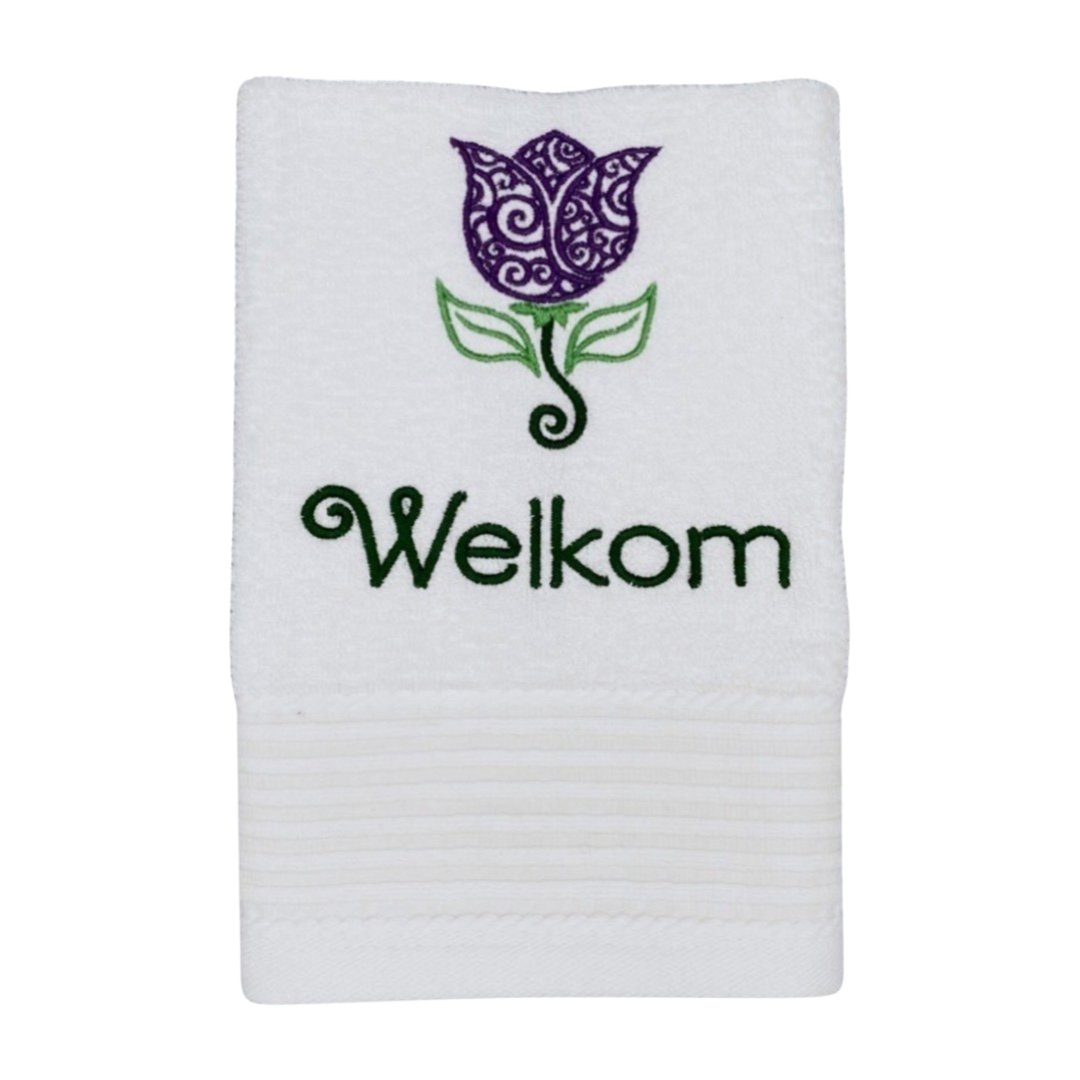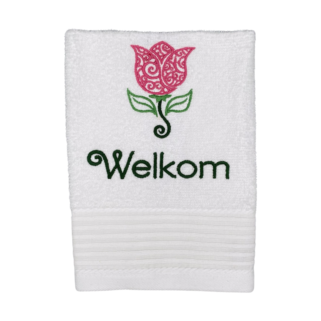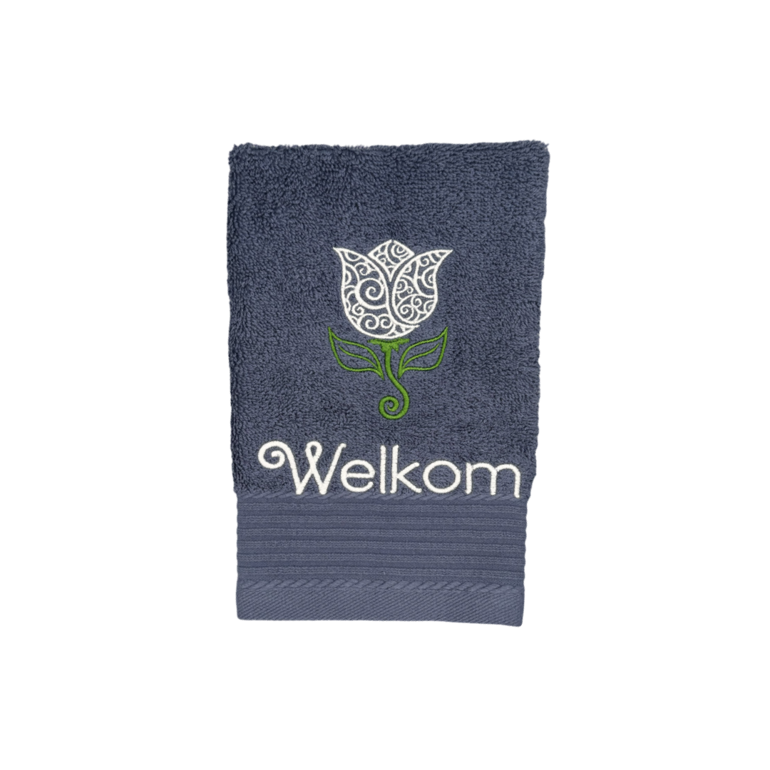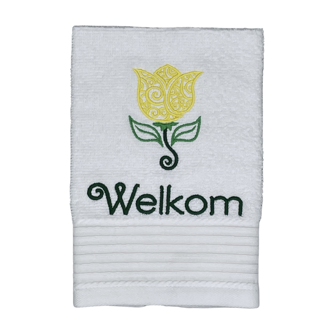 - Custom embroidered with a swirl tulip and "Welkom" in your choice of colors