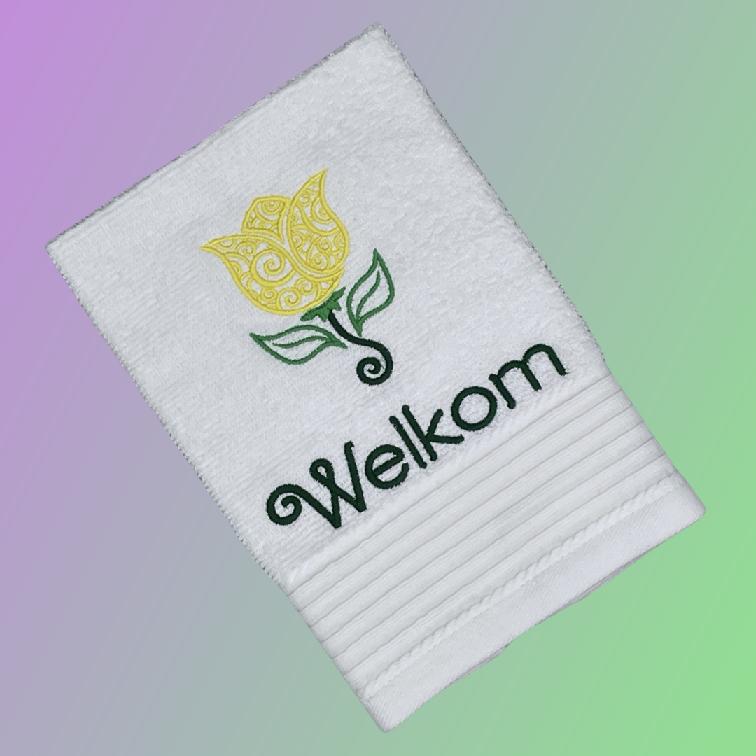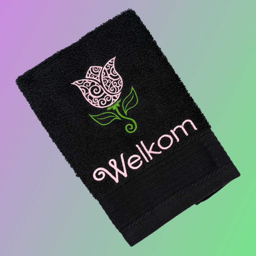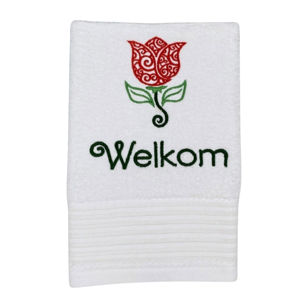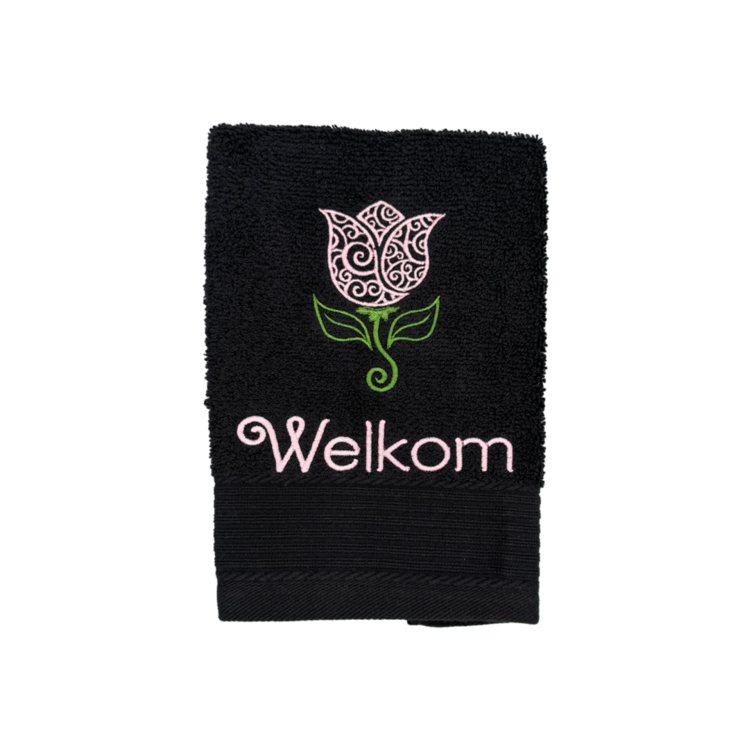 - Custom embroidered with a swirl tulip and "Welkom" in your choice of colors