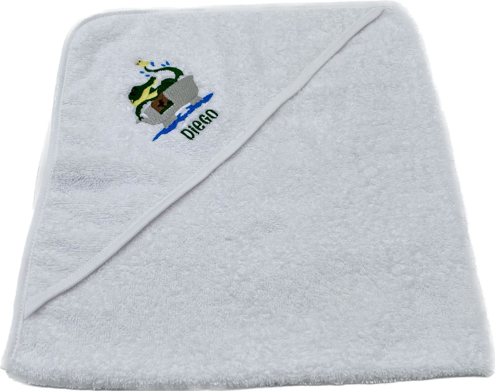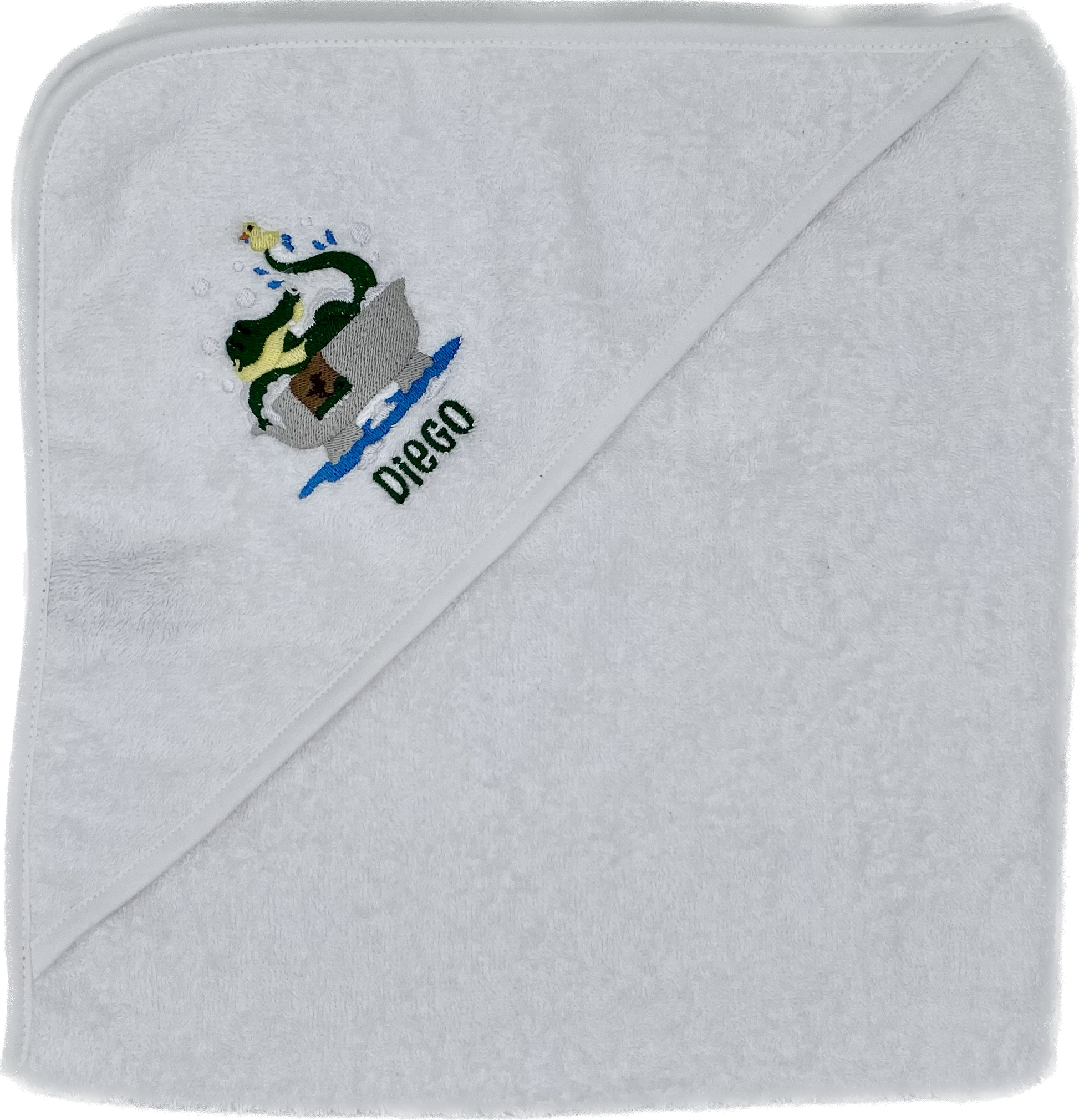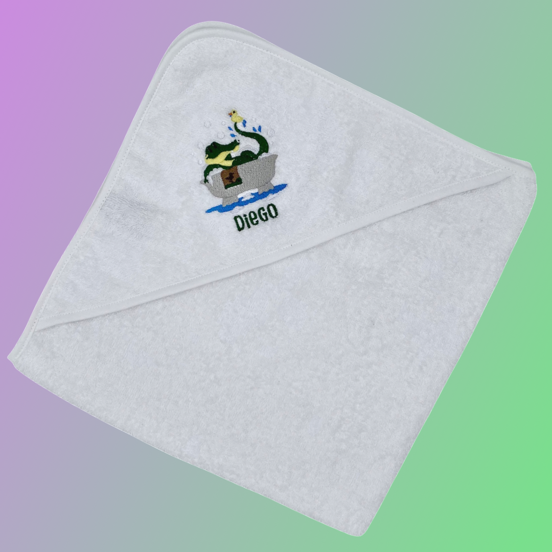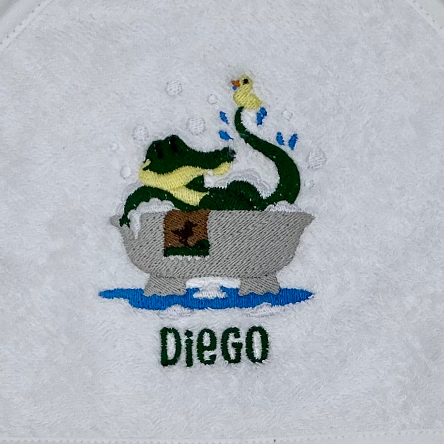 - Custom embroidered on the corner hood with a crododile/alligator in a bathtub
