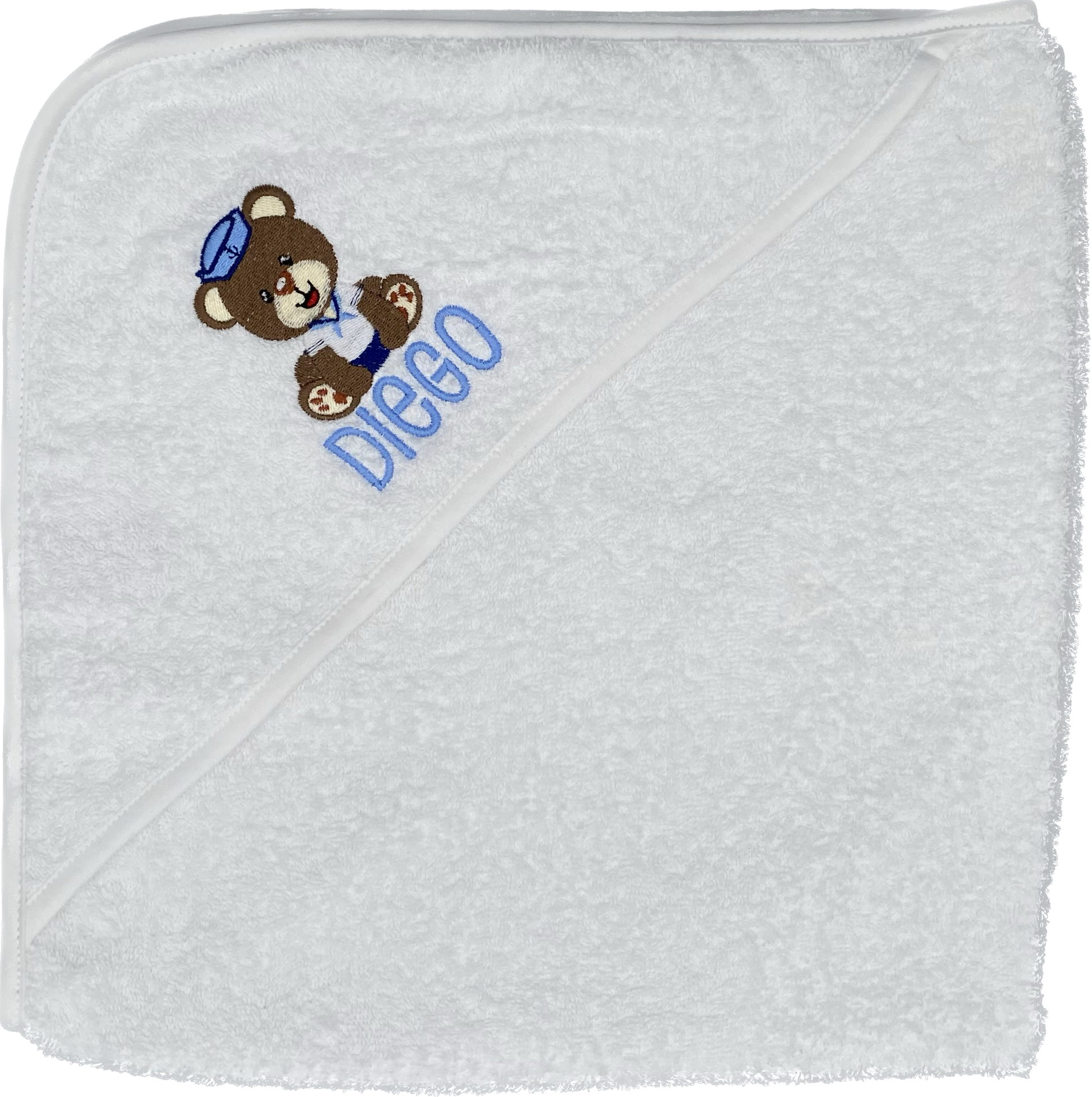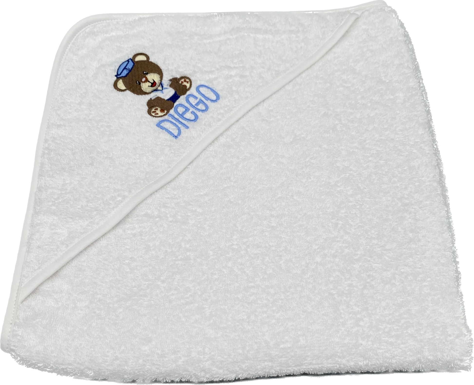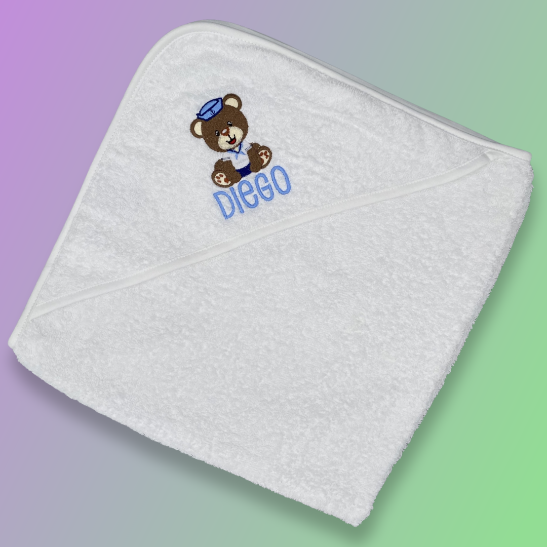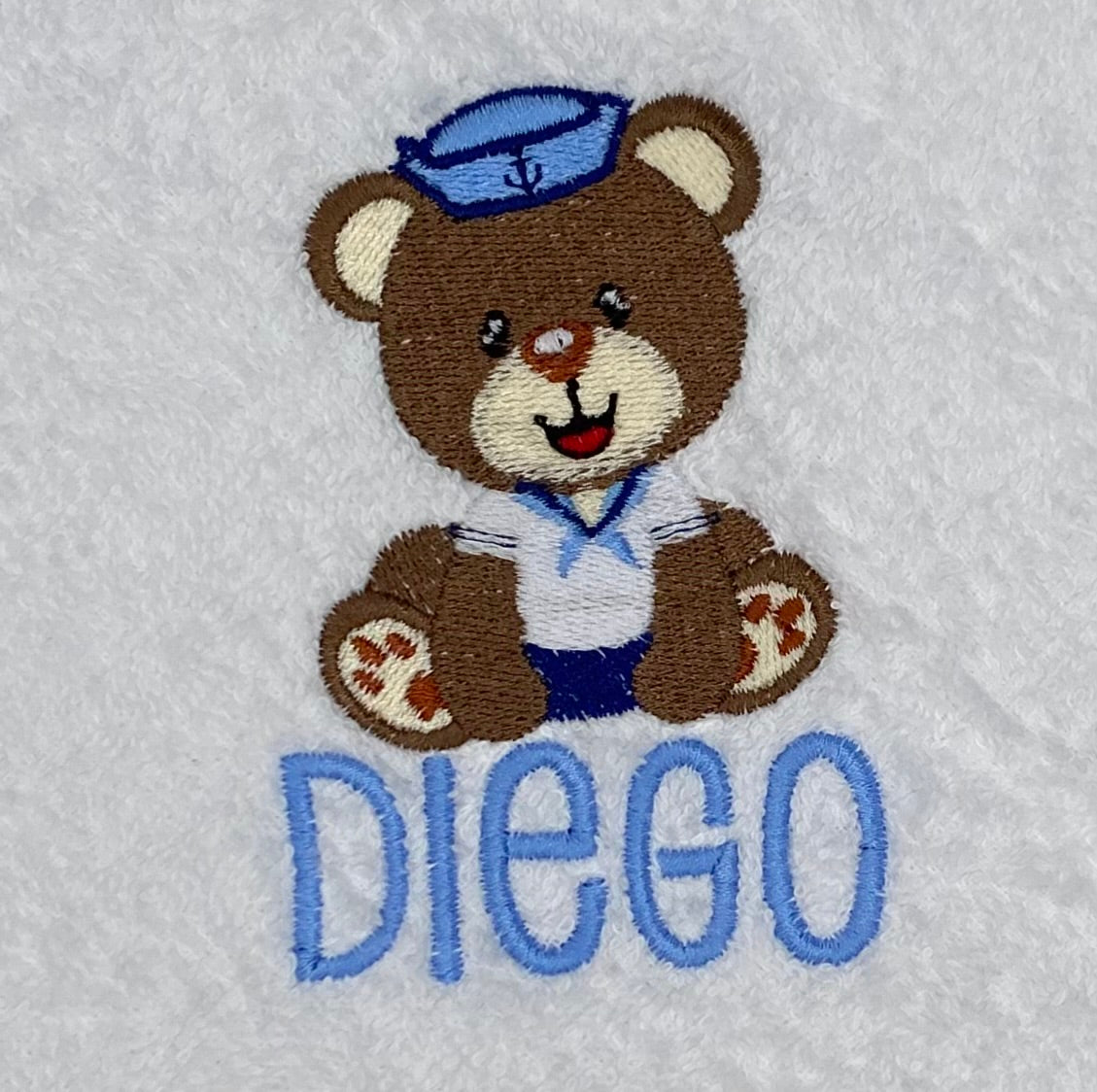 - Custom embroidered on the corner hood with a teddy bear in a sailor's outfit