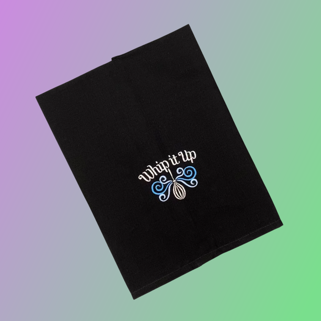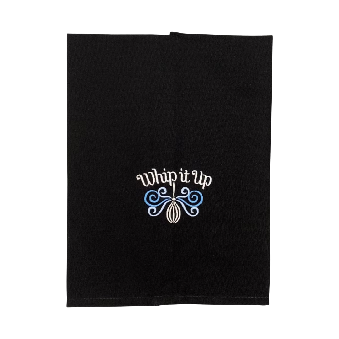 - Custom embroidered with a whisk, swirls, and "Whip It Up" near the bottom