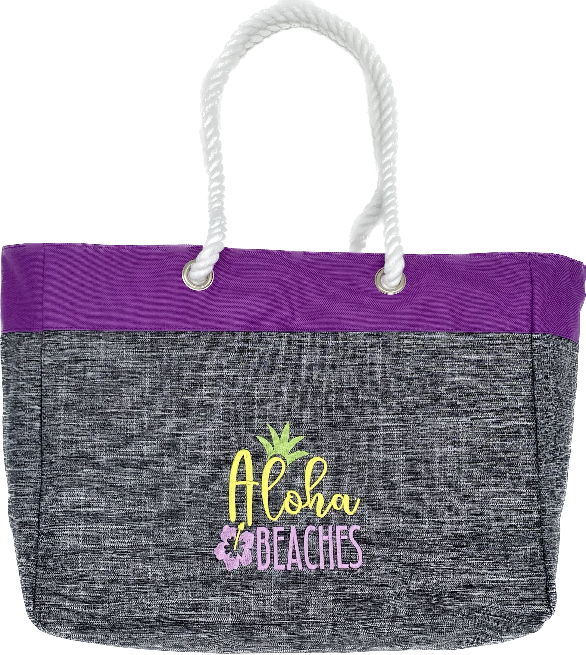 - "Aloha Beaches" with pineapple motif embroidered in bright colored threads