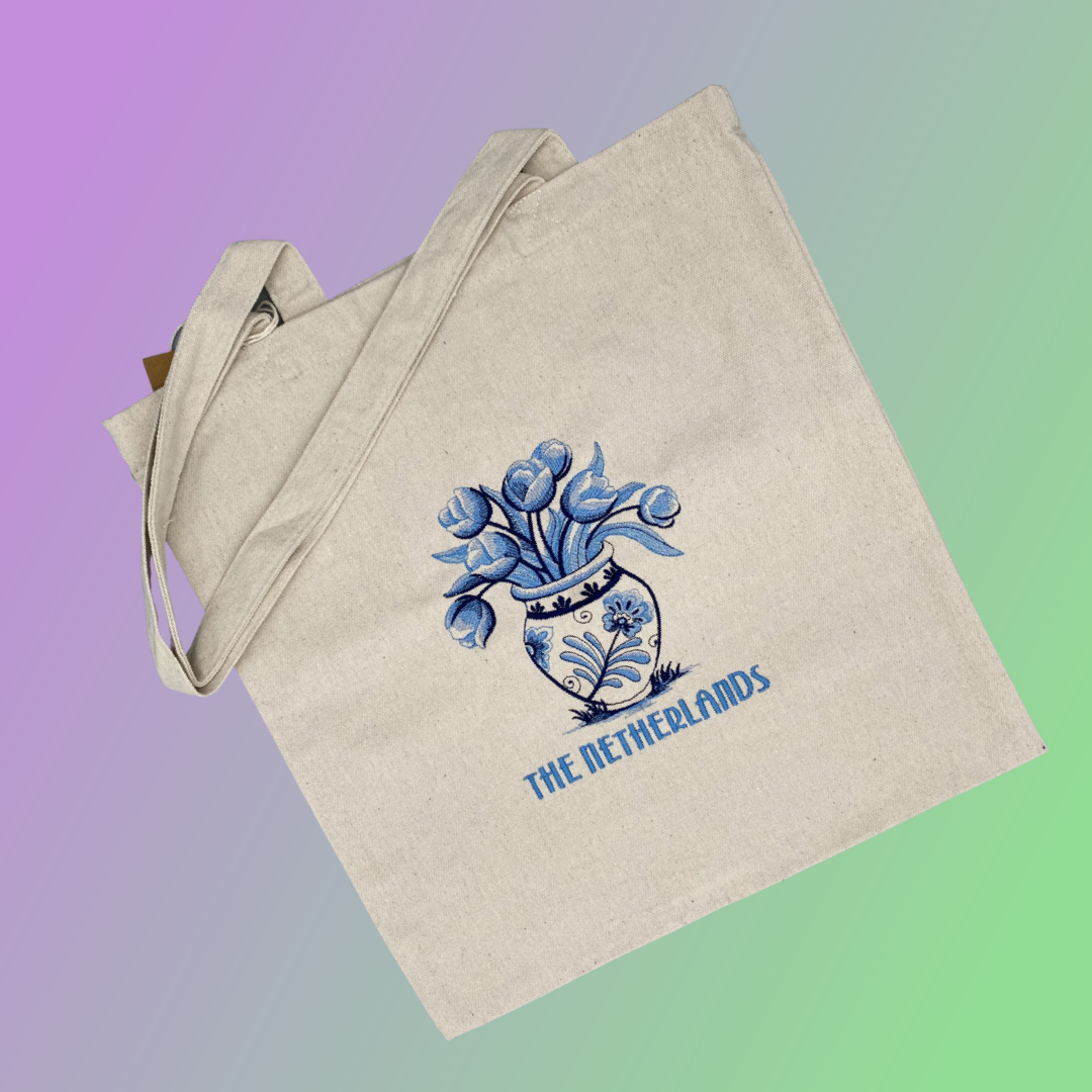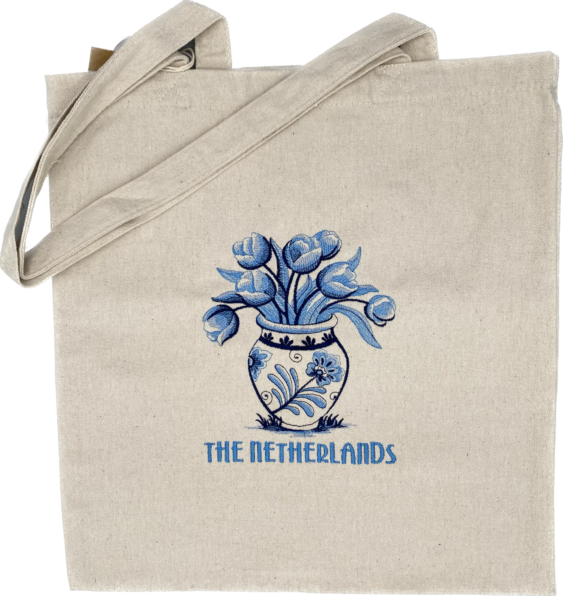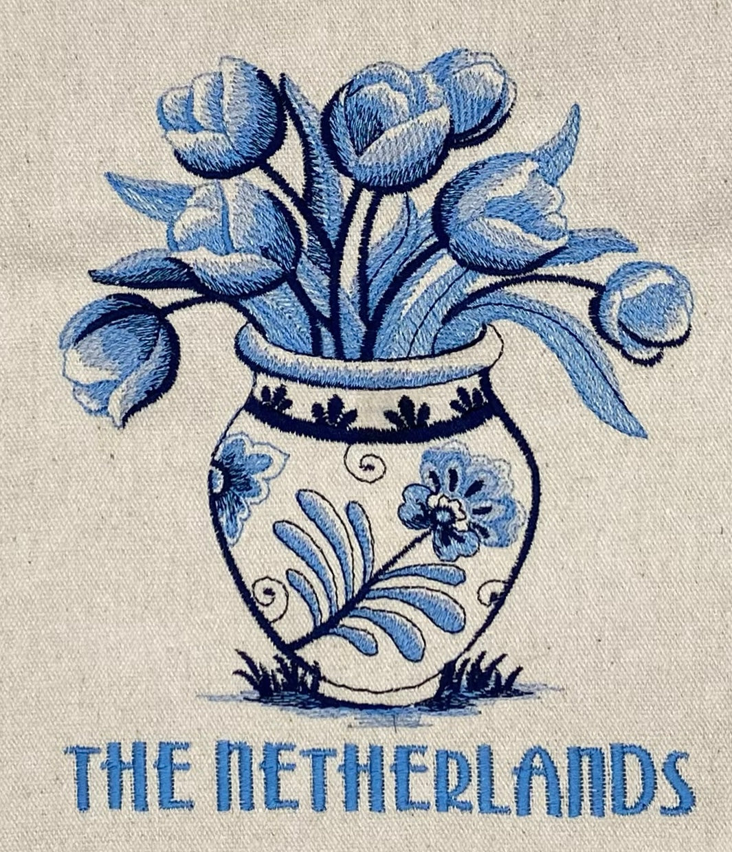 - Custom embroidered with a Delft Blue style Dutch vase with tulips and “The Netherlands"