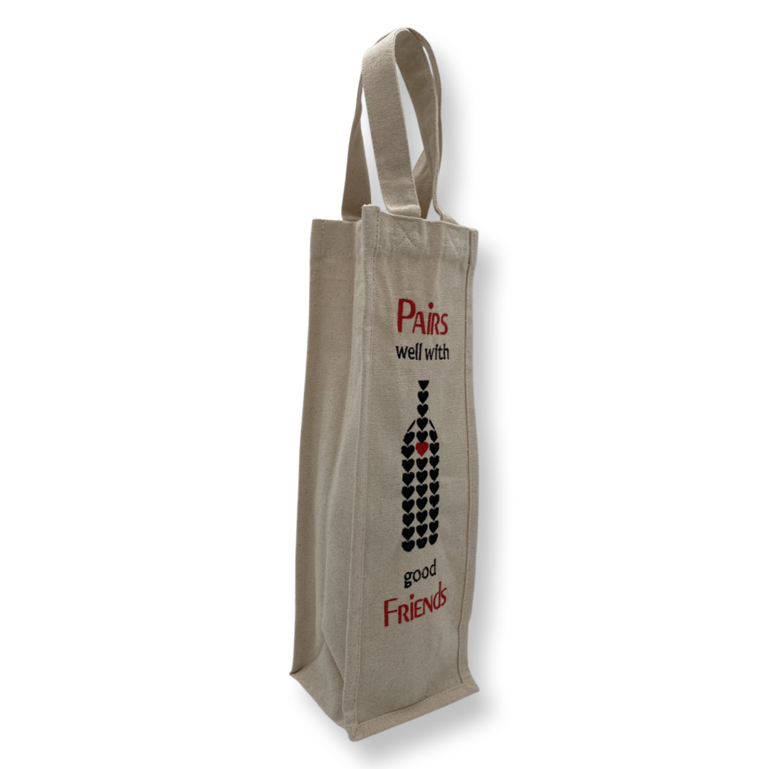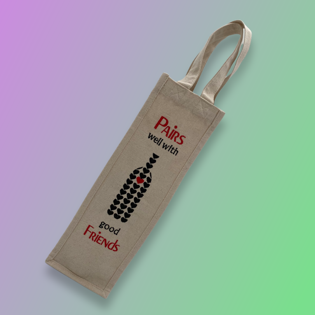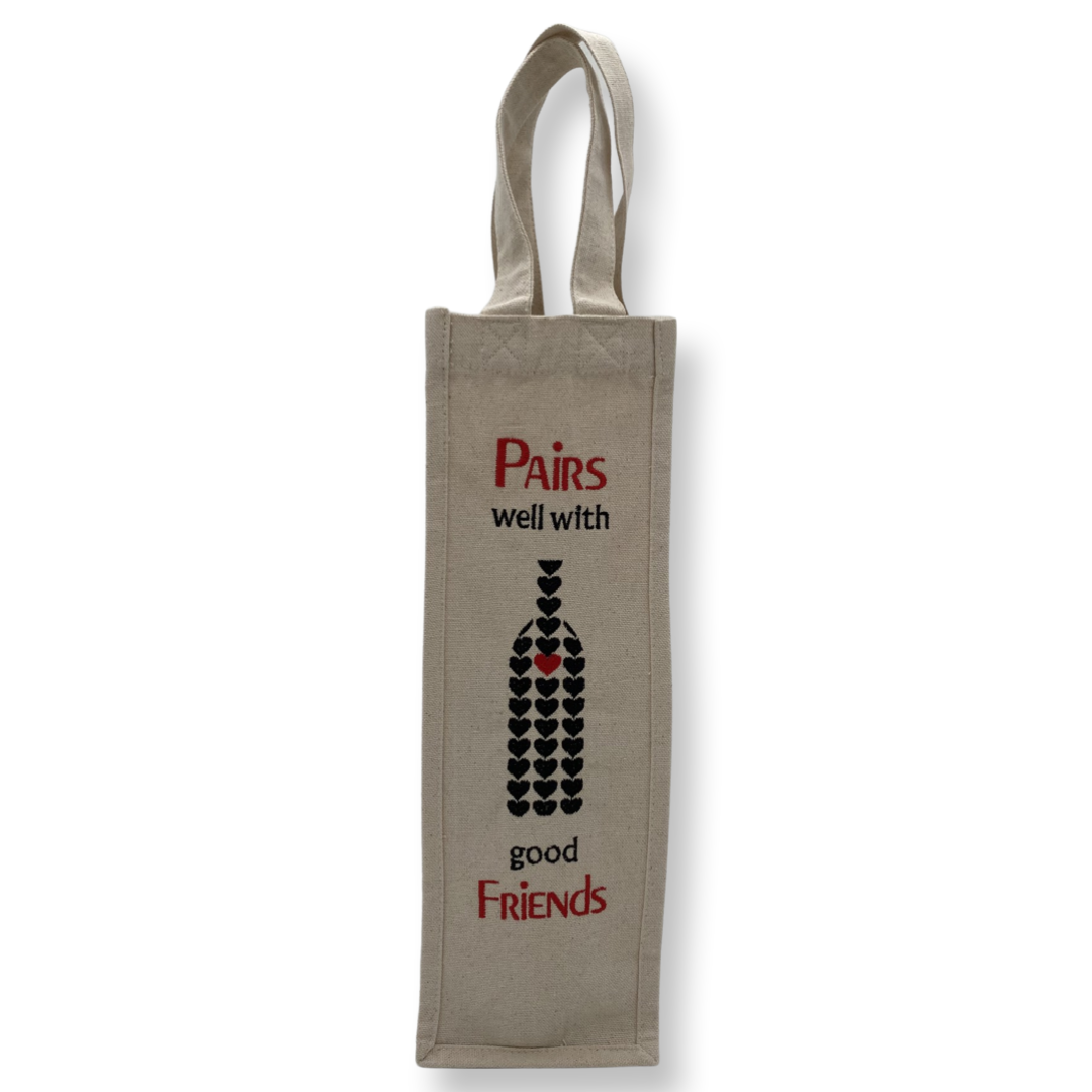 - Custom embroidered with “Pairs well with good Friends” and a wine bottle of hearts on the front