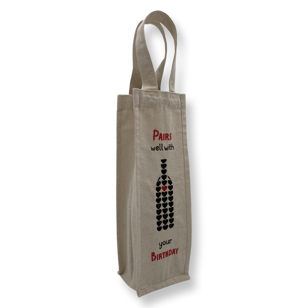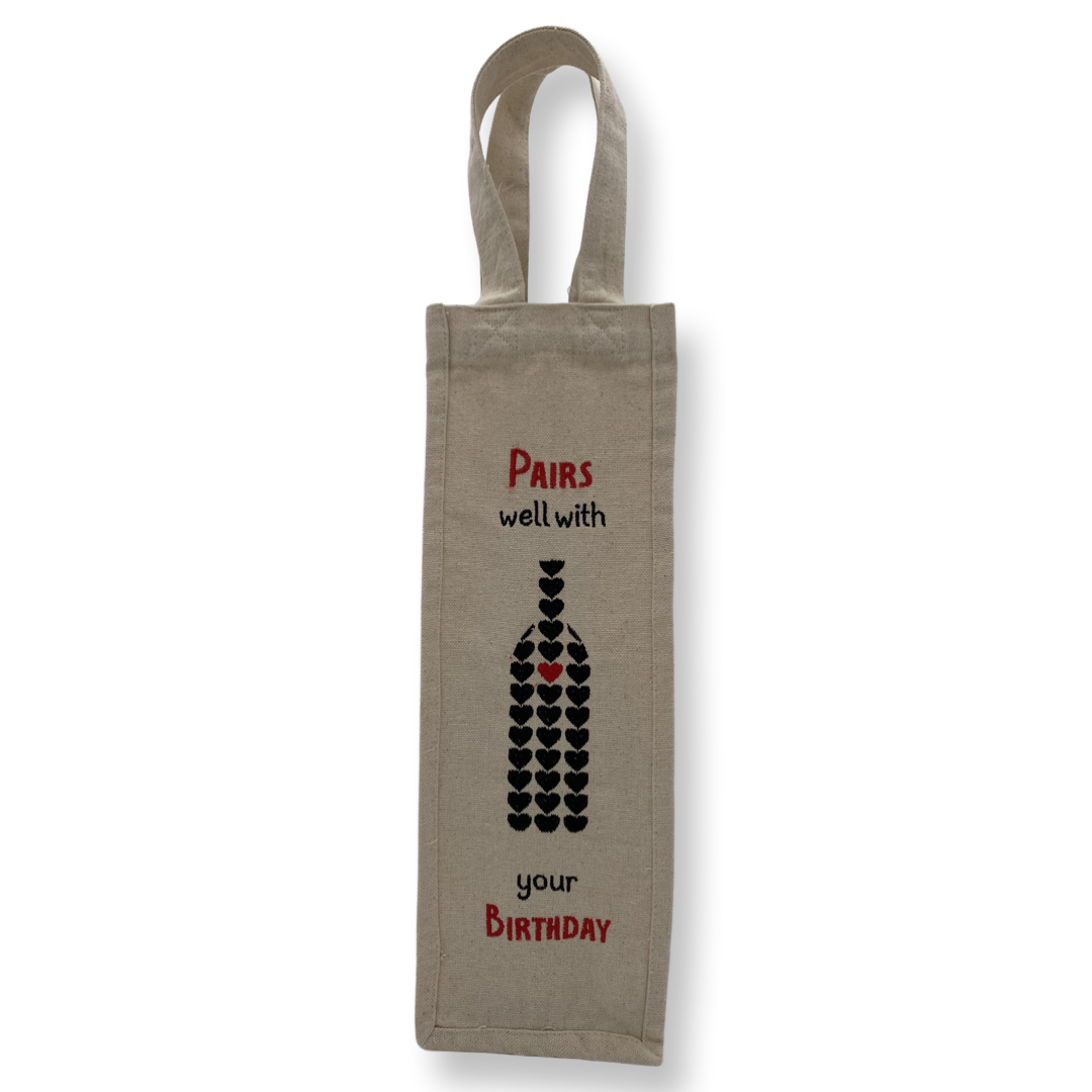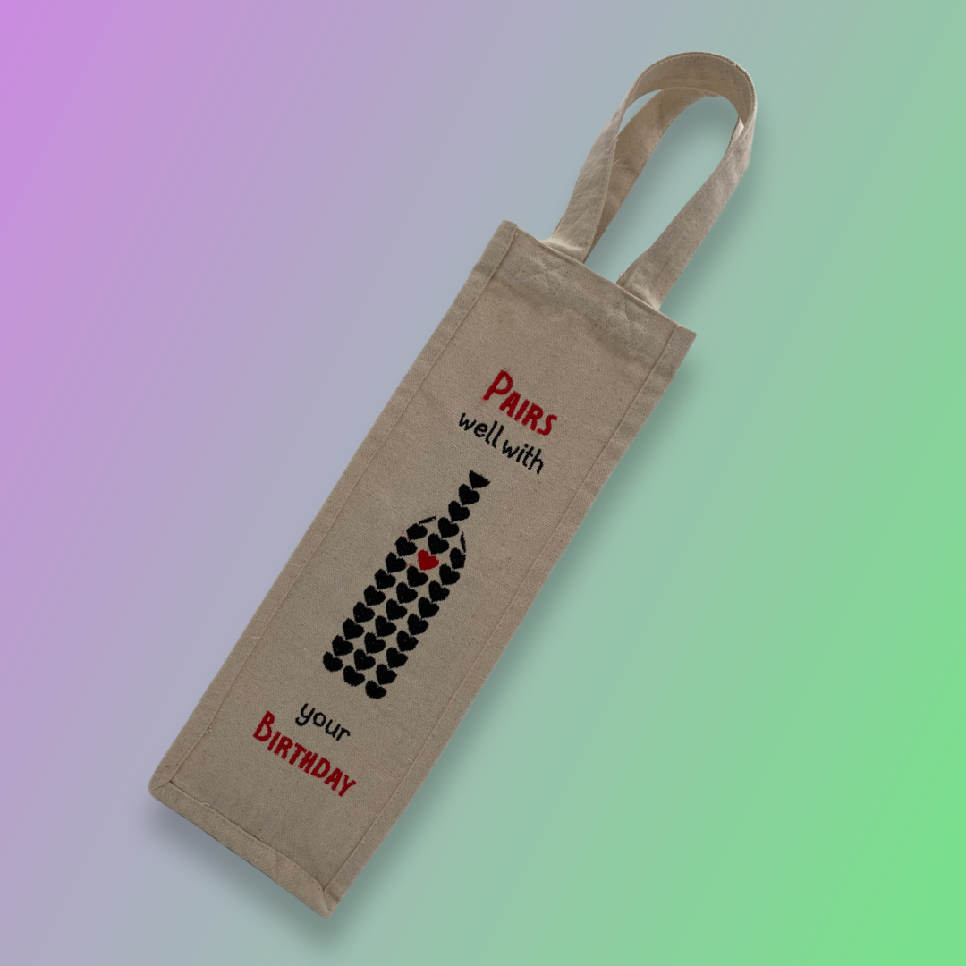 - Custom embroidered with “Pairs well with your Birthday” and a wine bottle of hearts on the front