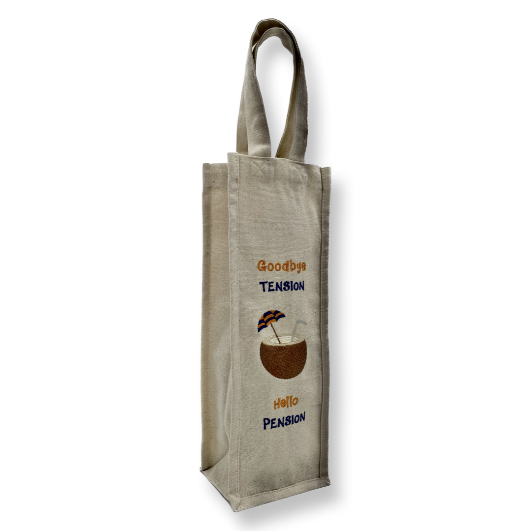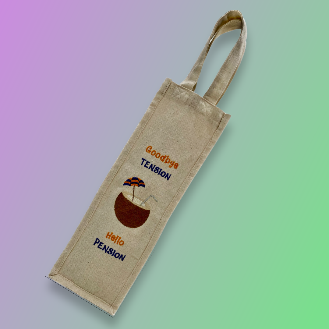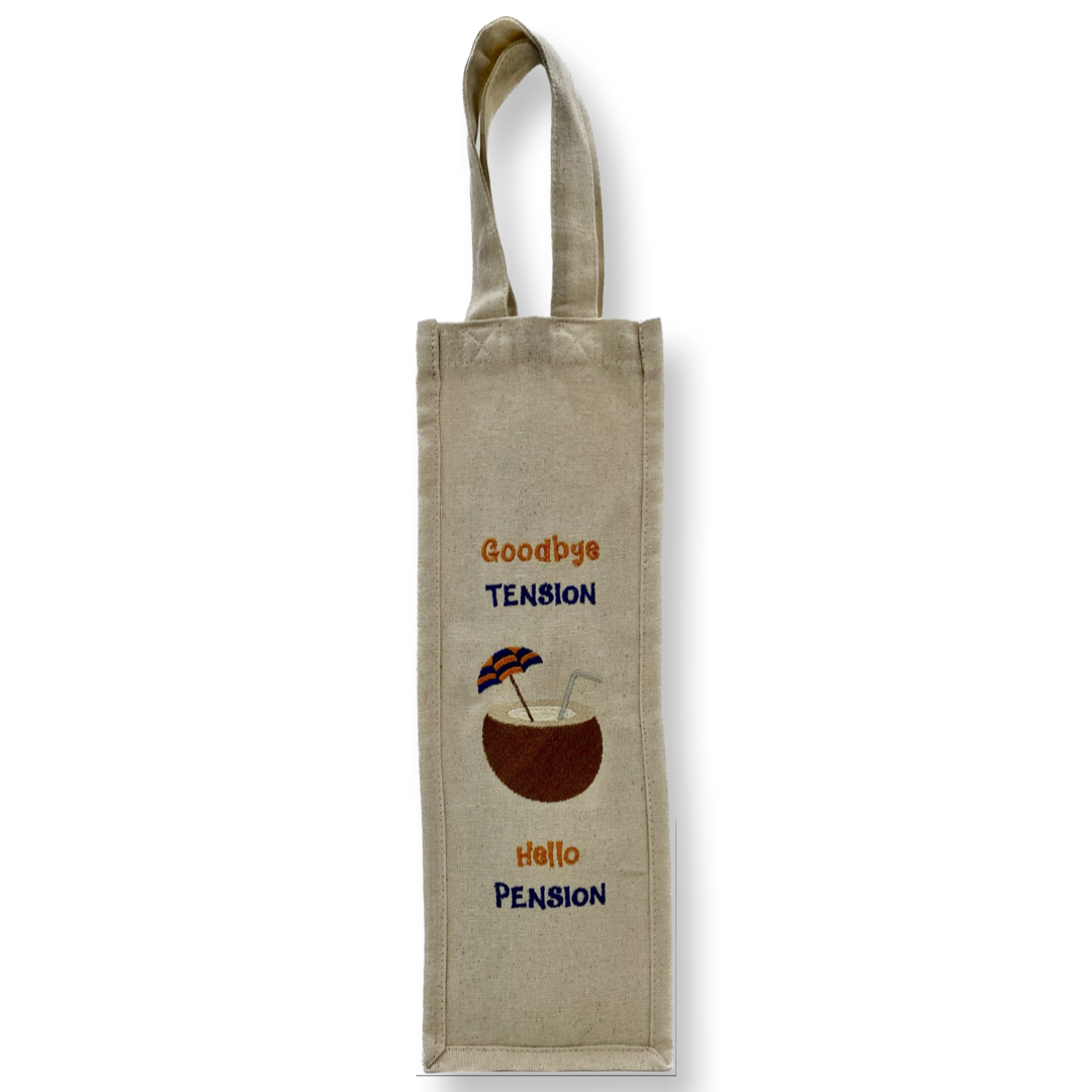 - Custom embroidered with “Goodbye Tension Hello Pension”, and a coconut drink with straw and umbrella on the front